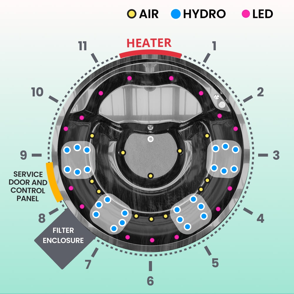 All-inclusive luxurious hot tub with a marble black acrylic insert and Premium filtration. This configuration includes: