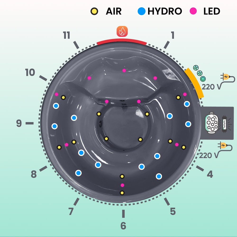 - Air jet massage system, 12 jets, 0.7 kW (£ 550)