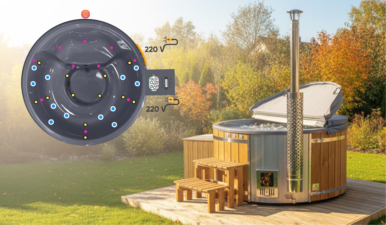 Klassische runde Form mit zeitlosem skandinavischem Flair. Gefertigt aus robustem ThermoWood und ausgestattet mit einem pflegeleichten grauen GFK-Einsatz. Wählen Sie das Modell mit den gewünschten Luft- und Hydrodüsen – und ergänzen Sie es optional mit einem Filtersystem für kristallklares Wasser.