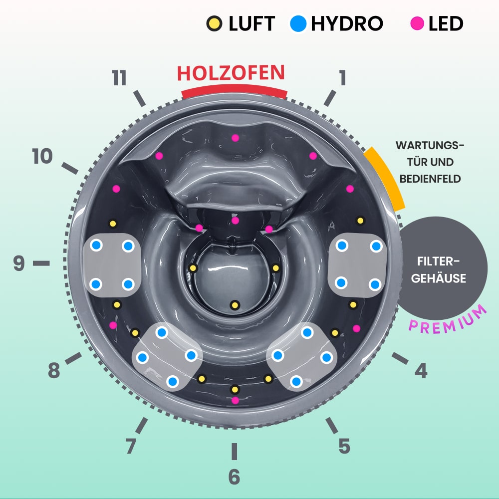 All-inclusive Hot Tub mit Acryleinsatz und Premium-Filtersystem. Diese Konfiguration beinhaltet: