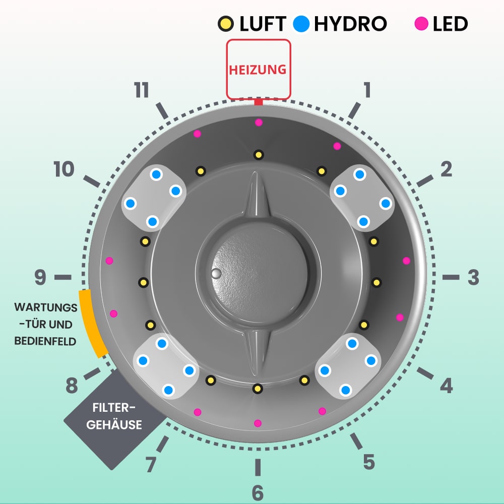 - Luftdüsen-Massagesystem, 12 Düsen, 0,7 kW (550€)
