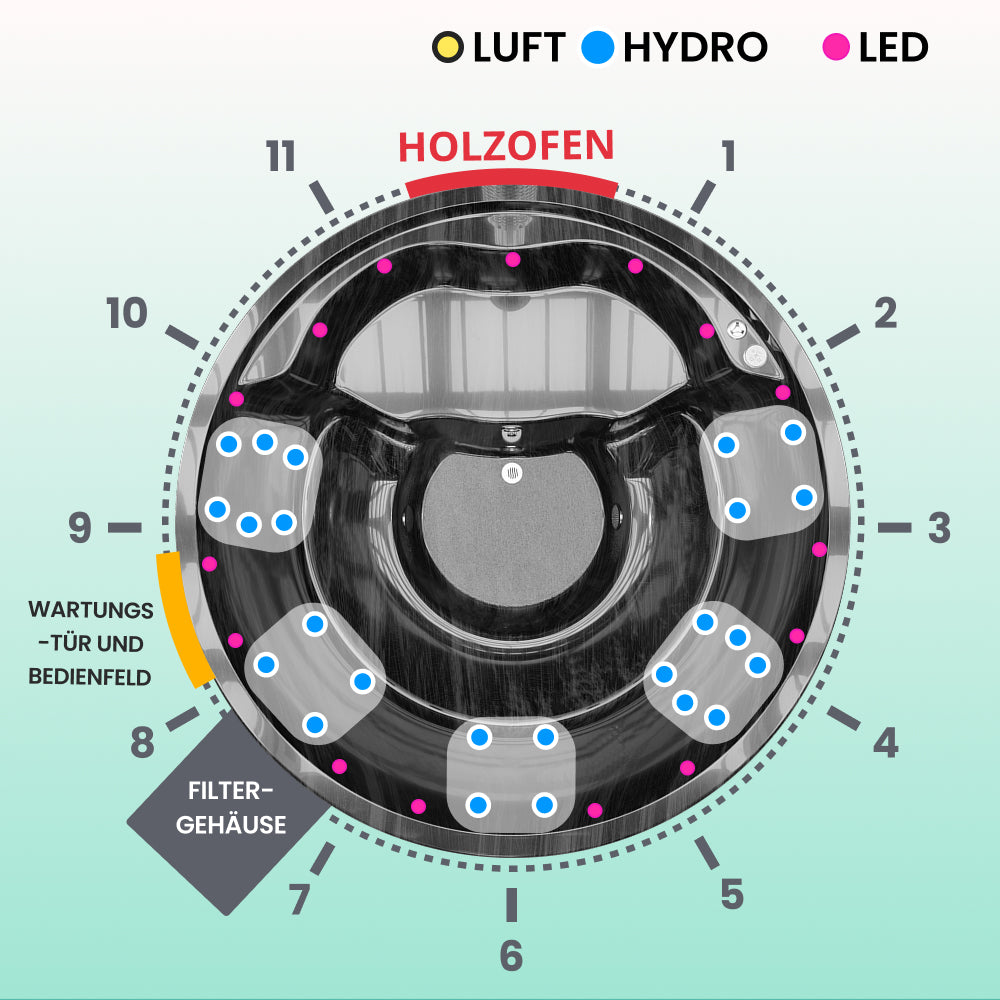 All-inclusive- Hot Tub mit marmorschwarzem Acryleinsatz und Premium Filterung. Diese Konfiguration umfasst: